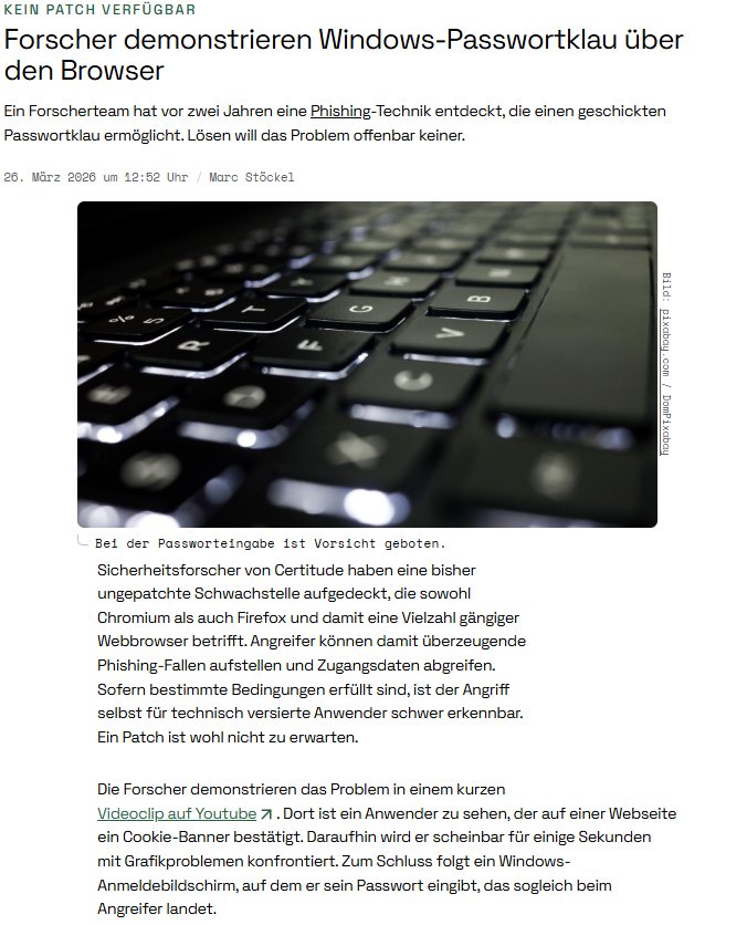 Golem.de berichtet über Certitude Research zu Vollbild-Phishing