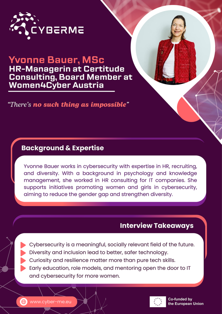 Yvonne Bauer wurde von der Österreichischen Computer Gesellschaft (OCG) im Rahmen des CyberMe Champions Blog interviewt, der ein Teil des Erasmus+-Projekts 𝗨𝗻𝗹𝗲𝗮𝘀𝗵𝗶𝗻𝗴 𝘁𝗵𝗲 𝗖𝘆𝗯𝗲𝗿 𝗣𝗼𝘁𝗲𝗻𝘁𝗶𝗮𝗹 𝗼𝗳 𝗬𝗼𝘂𝗻𝗴𝗪𝗼𝗺𝗲𝗻 ist, das darauf abzielt, junge Frauen mit den Fähigkeiten und dem Selbstvertrauen auszustatten, die für Karrieren im Bereich der Cybersicherheit erforderlich sind – und so zu mehr Geschlechtervielfalt, Inklusion und Resilienz in diesem Bereich beizutragen.
