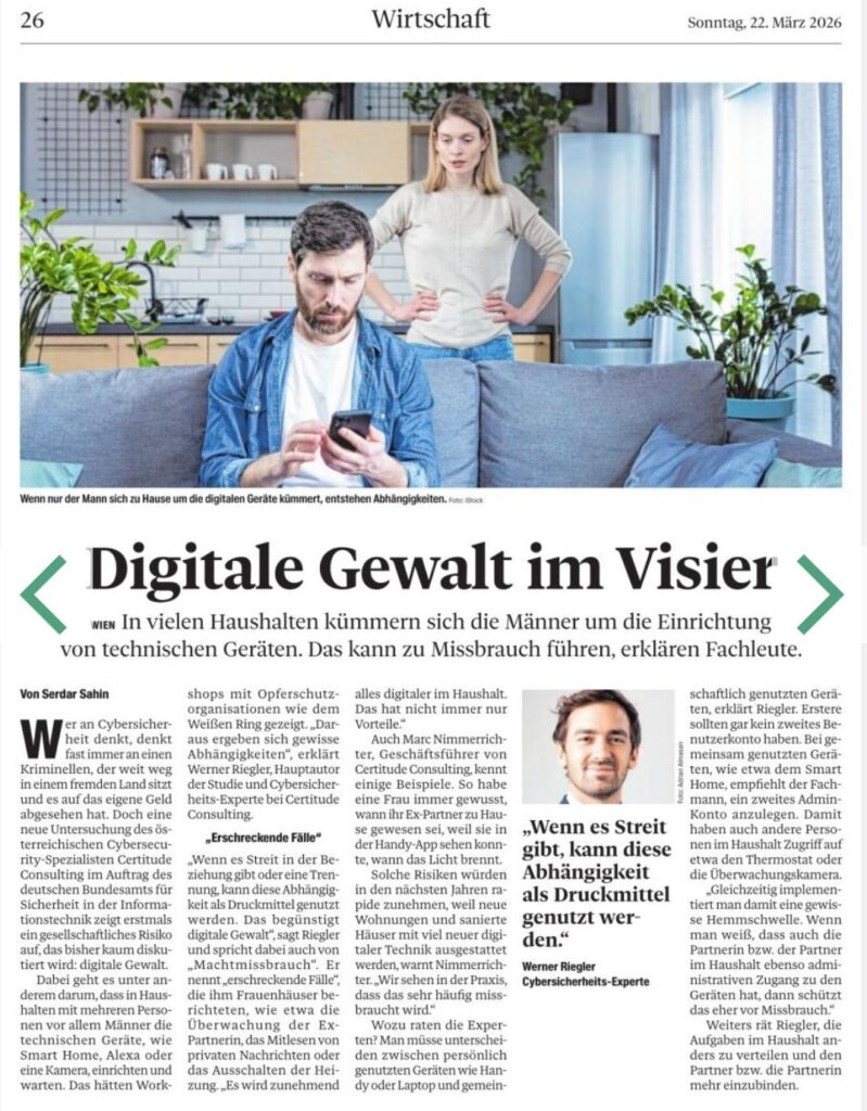 In an interview with the Tiroler Tageszeitung our Cybersecurity experts Werner Riegler and Marc Nimmerrichter discuss a risk that has often been underestimated: digital dependencies within private households.